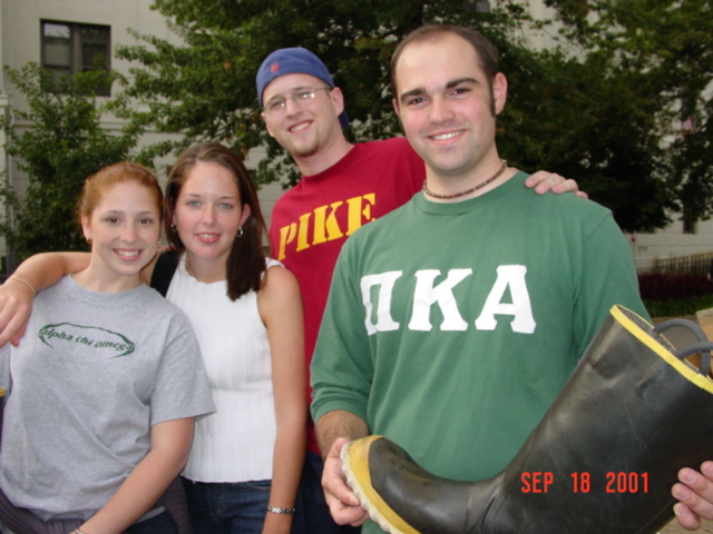 9.18.01: After only one day of fundraising Pike and Alpha Chi Omega have collected $1,247 for the relief efforts of the American Red Cross. From 10:00am until 5:00pm, brothers and sisters manned a table outside the Mary Gradon Center where they distributed red, white, and blue memorial ribbons to donators. Although all 225 ribbons ran out in just over four hours, the donations continued to pour in. After the day's work was completed at the table, brothers took to rush hour traffic at Ward Circle to solicit contributions from drivers waiting at red lights. In addition, there were collection areas in TDR (Terrace Dining Room) during dinner hours.